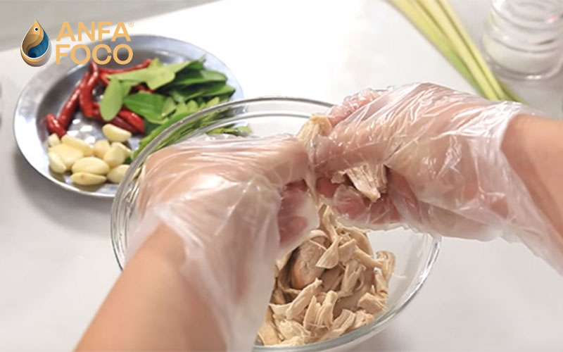 Trước khi thực hiện làm khô gà xé lá chanh thì bạn cần phải chú ý đeo găng tay và đội mũ để đảm bảo an toàn thực phẩm trong khi thực hiện.